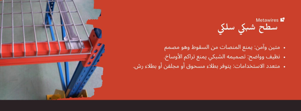 تُستخدم أرضيات شبك الأسلاك عادةً كإجراء أمان على رفوف المنصات الانتقائية لمنع سقوط المنصات أو المنتجات المخزنة عليها من خلال هيكل الرف. تتوفر أرضيات شبك الأسلاك بسماكات وأبعاد شبكية مختلفة. كما يُسهّل تصميمها تحديد محتويات الرفوف ويمنع تراكم الأوساخ والحطام عليها بسبب ثقوب الشبكة.